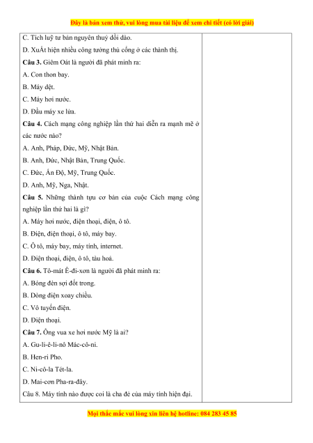 Câu 3. Giêm Oát là người đã phát minh ra: A. Con thon bay. B. Máy dệt. C. Máy hơi nước. D. Đầu máy xe lửa.