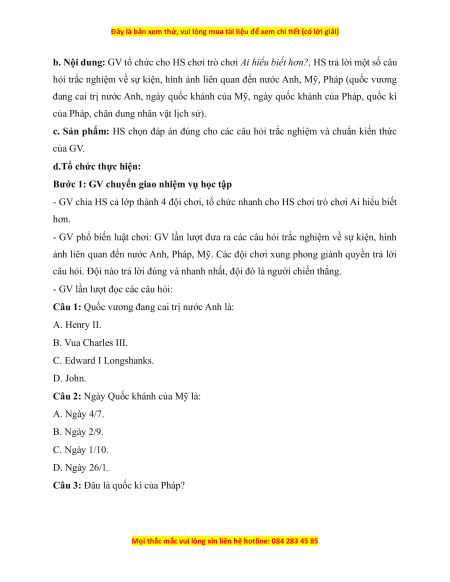 - GV phổ biến luật chơi: GV lần lượt đưa ra các câu hỏi trắc nghiệm về sự kiện, hình