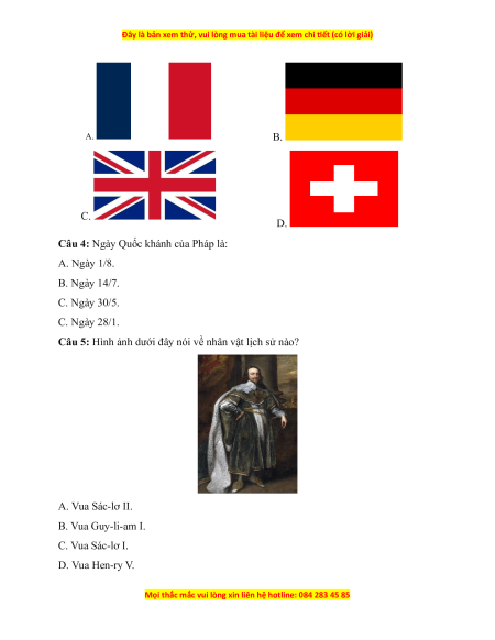 Câu 4: Ngày Quốc khánh của Pháp là: A. Ngày 1/8. B. Ngày 14/7. C. Ngày 30/5. C. Ngày 28/1.