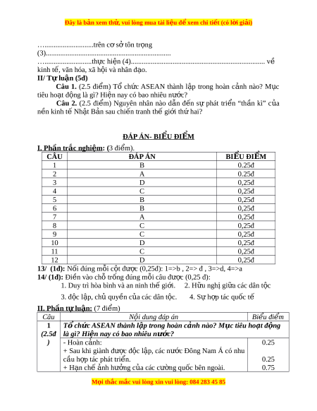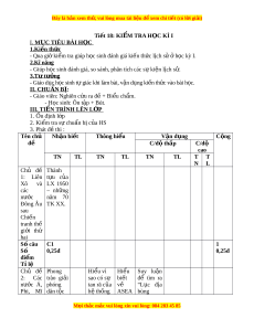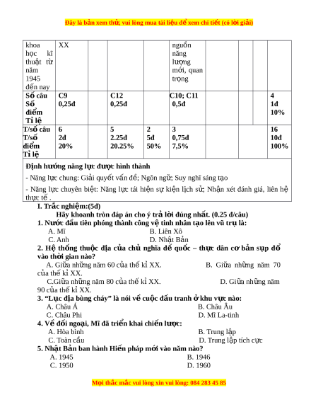 Đây là bản xem th , vu ử i lòng mua tài li u ệ đ xe ể m chi ti t (c ế ó l i ờ gi i ả ) khoa XX nguồn h c ọ kĩ năng thu t ậ từ lư ng ợ năm m i ớ , quan 1945 tr ng ọ đ n nay ế Số câu C9 C12 C10; C11 4 Số 0,25đ 0,25đ 0,5đ 1đ đi m ể 10% Tỉ lệ T/số câu 6 5 2 3 16 T/số 2đ 2.25đ 5đ 0,75đ 10đ đi m ể 20% 20.25% 50% 7,5% 100% Tỉ lệ Đ nh h ị ư ng năng l ớ c ự đư c ợ hình thành - Năng l c chung: ự Gi i ả quy t ế v n đ ấ ; ề Ngôn ng ; ữ Suy nghĩ sáng t o ạ - Năng l c ự chuyên bi t ệ : Năng l c ự tái hi n ệ sự ki n ệ l ch ị s ; ử Nh n