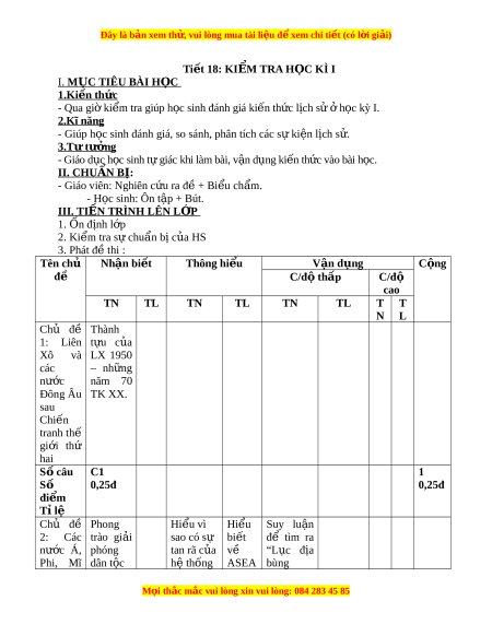 Đây là bản xem th , vu ử i lòng mua tài li u ệ đ xe ể m chi ti t (c ế ó l i ờ gi i ả ) Ti t ế 18: KI M Ể TRA H C Ọ KÌ I I . M C Ụ TIÊU BÀI H C Ọ 1.Ki n t ế h c ứ - Qua gi ờ ki m ể tra giúp h c ọ sinh đánh giá ki n ế th c ứ l c ị h sử ở h c ọ kỳ I. 2.Kĩ năng - Giúp h c s