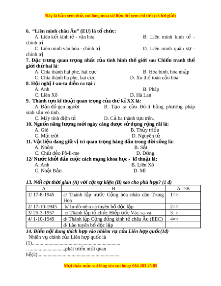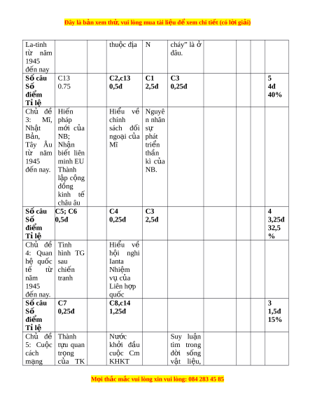 Đây là bản xem th , vu ử i lòng mua tài li u ệ đ xe ể m chi ti t (c ế ó l i ờ gi i ả ) La-tinh thu c ộ đ a ị N cháy” là ở từ năm đâu. 1945 đ n nay ế Số câu C13 C2,c13 C1 C3 5 Số 0.75 0,5đ 2,5đ 0,25đ 4đ đi m ể 40% Tỉ lệ Chủ đề Hi n ế Hi u ể về Nguyê 3: Mĩ, pháp chính n nhân Nh t ậ m i ớ c a ủ sách đ i ố sự B n, ả NB; ngo i ạ c a ủ phát Tây Âu Nh n ậ Mĩ tri n ể từ năm bi t ế liên thần 1945 minh EU kì c a ủ đ n nay ế . Thành NB. l p ậ c ng ộ đồng kinh tế châu âu Số câu C5; C6 C4 C3 4 Số 0,5đ 0,25đ 2,5đ 3,25đ đi m ể 32,5 Tỉ lệ % Chủ đề Tình Hi u ể về 4: Quan hình TG h i ộ nghi hệ quốc sau Ianta tế từ chi n ế Nhi m ệ năm tranh v c ụ a ủ 1945 Liên h p ợ đ n nay ế . quốc Số câu C7 C8,c14 3 Số 0,25đ 1,25đ 1,5đ đi m ể 15% Tỉ lệ Chủ đề Thành Nư c ớ Suy lu n ậ 5: Cuộc t u ự quan kh i ở đ u ầ tìm trong cách tr ng ọ cu c ộ Cm đ i ờ sống m ng ạ c a ủ TK KHKT v t ậ li u, ệ M i ọ thắc m c