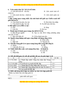 C. Chia thành ba phe, hai c c ự D. Xu thế toàn c u hóa. ầ 8. H i ộ ngh I ị -an-ta di n ra t ễ i ạ : A. Anh B. Pháp C. Liên Xô D. Hà Lan 9. Thành t u kĩ ự thu t ậ quan tr ng ọ c a t ủ h k ế X ỉ X là: A. B n ả đồ gen ngư i ờ B. T o ạ ra c u ừ Đô-li b ng ằ phư ng ơ pháp sinh s n ả vô tính. C. Máy tính đi n t ệ ử D. C ba t ả hành t u t ự rên. 10. Ngu n năng l ồ ư ng m ợ i ớ ngày càng đư c ợ s d ử ng r ụ ng rãi ộ là: A. Gió B. Th y t ủ ri u ề C. M t ặ tr i ờ D. Nguyên tử 11. V t ậ li u đang gi ệ v ữ t