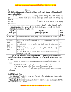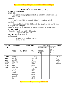 ọ inh đánh giá, so sánh, phân tích các s ki ự n l ệ ch s ị . ử 3.Thái độ - Giáo d c h ụ c ọ sinh t gi ự ác khi làm bài, v n d ậ ng ki ụ n t ế h c ứ vào bài h c. ọ 4. Năng l c c ự n h ầ ư ng t ớ i ớ - Năng l c v ự n ậ d ng các ụ ki n ế th c đã h ứ c vào ọ trình bày các v n đ ấ l ề ch s ị ử II. CHUẨN B : Ị - Giáo viên: Nghiên c u ứ ra đ + B ề i u ể ch m ẩ . - H c s ọ inh: Ôn t p + B ậ út. III. TI N Ế TRÌNH LÊN L P Ớ 1. Ổn định l p ớ 2. Ki m ể tra sự chu n b ẩ c ị a ủ HS 3. Phát đ t ề hi : Tên chủ Nhận bi t ế Thông hi u ể Vận d ng ụ C ng ộ đ ề Cấp đ t ộ hấp Cấp độ cao TNKQ TL TNKQ TL TN TL TN T KQ K L Q 1.Vi t ệ Nh ng ữ sự Ý nghĩa Số câu: Nam kiện liên lịch sử 3 trong quan đ n ế và đi m ể : những th ng ắ c a ủ nguyên 4.25 năm cách nhân (42.5% 1930 - m ng ạ th ng ắ ) 1945 tháng Tám l i ợ c a ủ – 1945 cu c ộ Th i ờ gian kháng Bác hồ chi n ế đ c ọ tuyên chống ngôn đ c ộ Pháp l p ậ (1945- M i ọ thắc m c