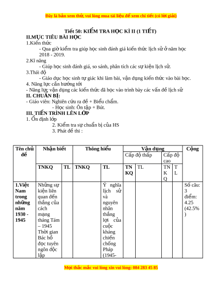 Đây là bản xem th , vu ử i lòng mua tài li u ệ đ xe ể m chi ti t (c ế ó l i ờ gi i ả ) Ti t ế 50: KI M Ể TRA H C Ọ KÌ II (1 TI T Ế ) II.M C Ụ TIÊU BÀI H C Ọ 1.Ki n t ế h c ứ - Qua gi ki ờ m ể tra giúp h c s ọ inh đánh giá ki n t ế h c l ứ ch s ị ử năm ở h c ọ 2018 - 2019. 2.Kĩ năng - Giúp h c s