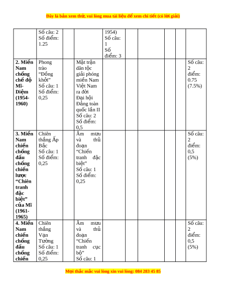 Đây là bản xem th , vu ử i lòng mua tài li u ệ đ xe ể m chi ti t (c ế ó l i ờ gi i ả ) Số câu: 2 1954) Số đi m ể : Số câu: 1.25 1 Số đi m ể : 3 2. Mi n ề Phong M t ặ tr n ậ Số câu: Nam trào dân t c ộ 2 ch ng ố “Đồng gi i ả phóng đi m ể : ch đ ế ộ kh i ở ” mi n N ề am 0.75 Mĩ- Số câu: 1 Việt Nam (7.5%) Di m ệ Số đi m ể : ra đ i ờ (1954- 0,25 Đ i ạ h i ộ 1960) Đ ng t ả oàn quốc lần II Số câu: 2 Số đi m ể : 0,5 3. Mi n ề Chiên Âm m u ư Số câu: Nam th ng ắ p Ấ và thủ 2 chi n ế B c ắ đo n ạ đi m ể : ch ng ố Số câu: 1 “Chi n ế 0,5 đấu Số đi m ể : tranh đ c ặ (5%) ch ng ố 0,25 bi t ệ ” chi n ế Số câu: 1 lược Số đi m ể : “Chiên 0,25 tranh đặc bi t ệ ” của Mĩ (1961- 1965) 4. Mi n ề Chiên Âm m u ư Số câu: Nam th ng ắ và thủ 2 chi n ế V n ạ đo n ạ đi m ể : ch ng ố Tư ng ờ “Chi n ế 0,5 đấu Số câu: 1 tranh c c ụ (5%) ch ng ố Số đi m ể : b ” ộ chi n ế 0,25 Số câu: 1 M i ọ thắc m c