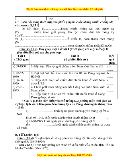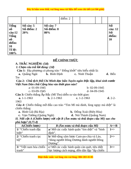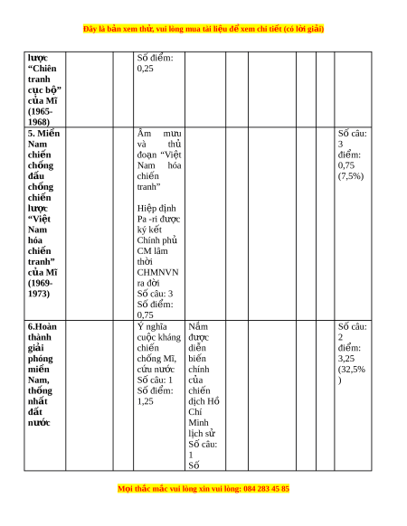 Đây là bản xem th , vu ử i lòng mua tài li u ệ đ xe ể m chi ti t (c ế ó l i ờ gi i ả ) lược Số đi m ể : “Chiên 0,25 tranh cục b ” ộ của Mĩ (1965- 1968) 5. Mi n ề Âm m u ư Số câu: Nam và thủ 3 chi n ế đo n ạ “Vi t ệ đi m ể : ch ng ố Nam hóa 0,75 đấu chi n ế (7,5%) ch ng ố tranh” chi n ế lược Hi p đ ệ nh ị “Vi t ệ Pa -ri đư c ợ Nam ký k t ế hóa Chính ph ủ chi n ế CM lâm tranh” th i ờ của Mĩ CHMNVN (1969- ra đ i ờ 1973) Số câu: 3 Số đi m ể : 0,75 6.Hoàn Ý nghĩa N m ắ Số câu: thành cu c kháng ộ đư c ợ 2 giải chi n ế di n ễ đi m ể : phóng chống Mĩ, bi n ế 3,25 mi n ề c u n ứ ư c ớ chính (32,5% Nam, Số câu: 1 c a ủ ) th ng ố Số đi m ể : chi n ế nhất 1,25 dịch Hồ đất Chí nư c ớ Minh lịch sử Số câu: 1 Số M i ọ thắc m c