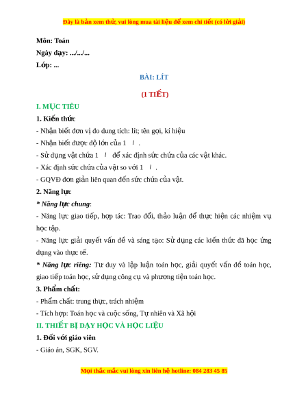 Ngày dạy: .../.../... L p: ớ ... BÀI: LÍT (1 TIẾT) I. M C Ụ TIÊU 1. Ki n t ế h c ứ - Nh n bi ậ t ế đ n ơ v đo dung t ị ích: lít; tên g i ọ , kí hi u ệ - Nh n bi ậ t ế được đ l ộ n c ớ a ủ 1 l . - S d ử ng v ụ t ậ ch a ứ 1 l đ xác ể định s c ch ứ a ứ c a các ủ v t ậ khác. - Xác định s c ứ ch a c ứ a ủ v t ậ so v i ớ 1 l . - GQVĐ đ n gi ơ n ả liên quan đ n s ế c ch ứ a ứ c a v ủ t ậ . 2. Năng l c ự