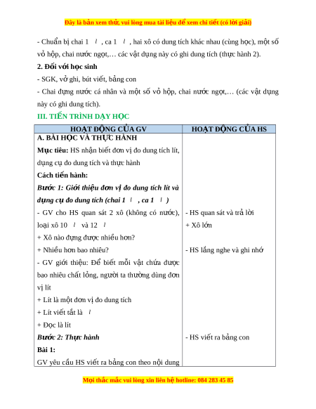 ẩ b ịchai 1 l , ca 1 l , hai xô có dung tích khác nhau (cùng h c) ọ , m t ộ số vỏ h p, chai ộ nư c ớ ng t ọ ,… các v t ậ d ng này có ghi ụ dung tích (th c hành 2) ự . 2. Đ i ố v i ớ h c s ọ inh - SGK, v ghi ở , bút vi t ế , b ng con ả - Chai đ ng ự nư c ớ cá nhân và m t ộ số vỏ h p, ộ chai nư c ớ ng t ọ ,… (các v t ậ d ng ụ này có ghi dung tích). III. TI N Ế TRÌNH D Y Ạ H C Ọ HOẠT Đ N Ộ G C A Ủ GV HOẠT Đ N Ộ G C A Ủ HS A. BÀI H C Ọ VÀ TH C Ự HÀNH Mục tiêu: HS nh n ậ bi t ế đ n ơ v ịđo dung tích lít, d ng c ụ