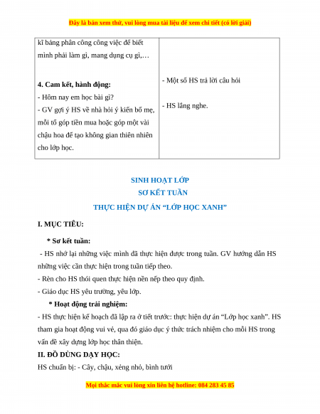 THỰC HIỆN DỰ ÁN “LỚP HỌC XANH” I. MỤC TIÊU: * Sơ kết tuần: