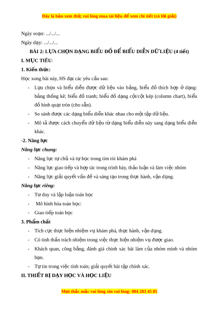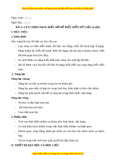 Đây là bản xem th , vu ử i lòng mua tài li u ệ đ xe ể m chi ti t ế (có l i ờ gi i ả ) Ngày so n ạ : .../.../... Ngày d y ạ : .../.../... BÀI 2: L A Ự CH N Ọ DẠNG BI U Ể Đ Ồ ĐỂ BI U Ể DI N Ễ DỮ LI U Ệ (4 ti t) ế I. MỤC TIÊU: 1. Ki n ế th c: ứ H c ọ xong bài này, HS đ t ạ các yêu c u ầ sau: - L a ự ch n ọ và bi u ể di n ễ đ c ượ dữ li u ệ vào b n ả g, bi u ể đồ thích h p ợ ở d n ạ g: b n ả g th n ố g kê; bi u ể đồ tranh; bi u ể đồ d n ạ g c t ộ /c t ộ kép (column chart), bi u ể đ ồ hình qu t ạ tròn (cho s n ẵ ). - So sánh đ c ượ các d n ạ g bi u ể di n ễ khác nhau cho m t ộ t p ậ d ữ li u ệ . - Mô tả đ c ượ cách chuy n ể dữ li u ệ từ d n ạ g bi u ể di n ễ này sang d n ạ g bi u ể di n ễ khác. -2. Năng l c ự Năng l c ự chung: - Năng l c ự t ự ch ủ và t ự h c ọ trong tìm tòi khám phá - Năng l c ự giao ti p ế và h p