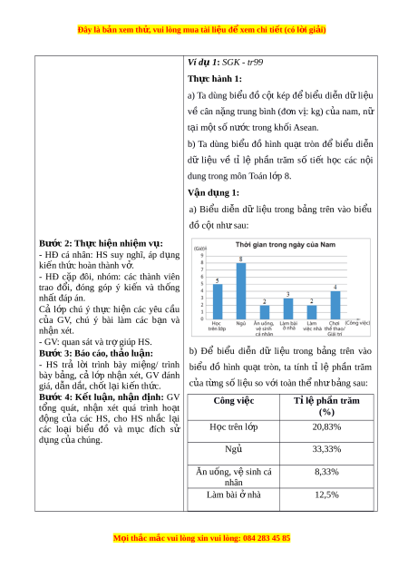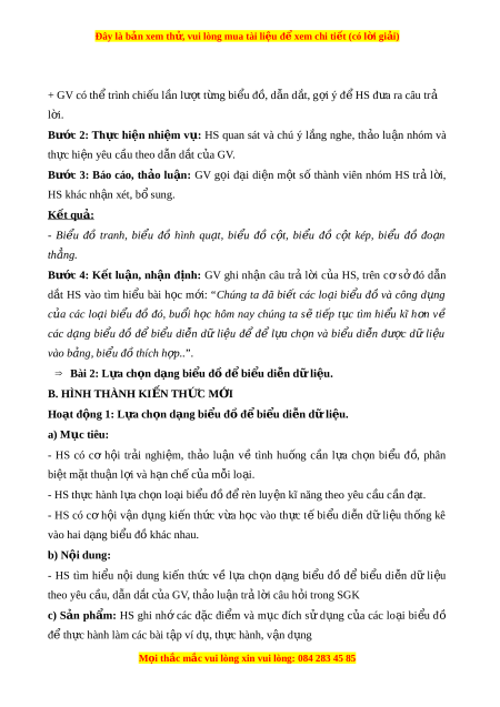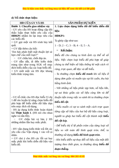 Đây là bản xem th , vu ử i lòng mua tài li u ệ đ xe ể m chi ti t ế (có l i ờ gi i ả ) d) T ổ ch c ứ th c ự hi n: ệ HĐ CỦA GV VÀ HS SẢN PHẨM D Ự KI N Ế Bư c ớ 1: Chuy n ể giao nhi m ệ v : ụ 1. L a ự ch n ọ d ng ạ bi u ể đồ để bi u ể di n ễ dữ - GV yêu c u ầ HS ho t ạ đ n ộ g c p ặ đôi li u ệ th o ả lu n ậ th c ự hi n ệ yêu c u ầ c a ủ HĐKP1 nh m ằ ôn l i ạ m c ụ tiêu c a ủ HĐKP1: các bi u ể đ . ồ Ta ghép c p ặ nh ư sau: + GV g i ọ m t ộ vài HS trình bày k t ế qu . ả