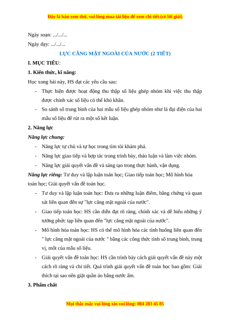 Giáo án Lực căng mặt ngoài của nước Toán 11 Kết nối tri thức