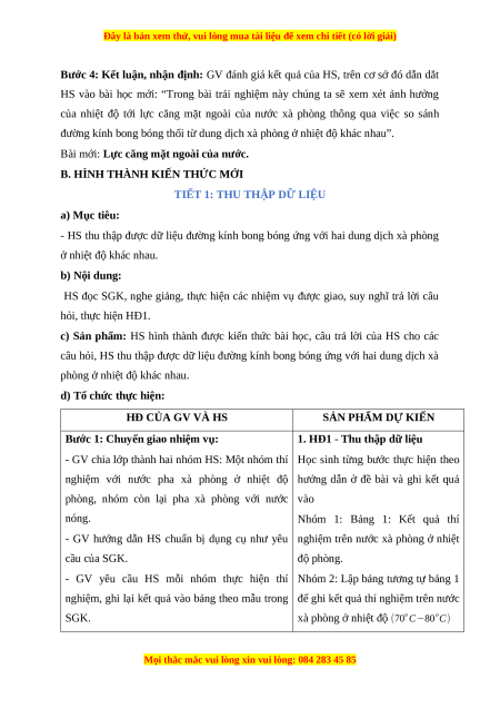 - HS thu thập được dữ liệu đường kính bong bóng ứng với hai dung dịch xà phòng ở nhiệt độ khác nhau. b) Nội dung: