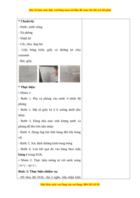 - GV hướng dẫn HS chuẩn bị dụng cụ như yêu nghiệm trên nước xà phòng ở nhiệt cầu của SGK. độ phòng.