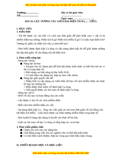 ạ …………………… BÀI 16: L C Ự TƯ NG Ơ TÁC GI A Ữ HAI ĐI N Ệ TÍCH (...... TI T Ế ) I. M C Ụ TIÊU 1. Ki n ế th c ứ - Trả l i ờ đư c ợ các câu h i: ỏ Có cách nào đ n ơ gi n ả để phát hi n ệ xem 1 v t ậ có bị nhi m ễ đi n ệ hay không. Đi n ệ tích là gì? Đi n ệ tích đi m ể là gì? Có m y ấ lo i ạ đi n ệ tích? Tư ng ơ tác gi a ữ các đi n ệ tích x y ả ra nh ư th ế nào? - Phát bi u ể đư c ợ đ nh ị lu t ậ Cu-lông và v n ậ d ng ụ đ nh ị lu t ậ đó để gi i ả đư c ợ nh ng ữ bài tập đ n ơ gi n ả v ề cân b ng ằ c a ủ h ệ đi n ệ tích. 2. Phát tri n ể năng l c ự - Năng l c ự chung: ● Năng l c ự t ự h c ọ :