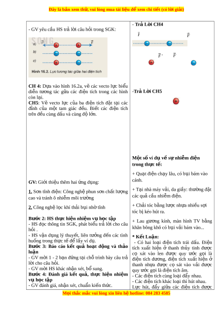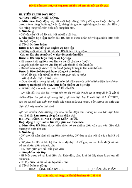 Đây là bản xem th , vu ử i lòng mua tài li u ệ đ xe ể m chi ti t ế (có l i ờ gi i ả ) III. TI N Ế TRÌNH D Y Ạ H C Ọ A. HO T Ạ Đ NG Ộ KH I Ở Đ NG Ộ a. M c ụ tiêu: Hoạt đ ng ộ này, từ m t ộ ho t ạ đ ng ộ tư ng ơ đ i ố quen thu c ộ nh ng ư sẽ đư c ợ mô tả bằng thu t ậ ngữ v t ậ lý, không b ng ằ ngôn ng ữ h ng ằ ngày, t o ạ cho HS sự hào h ng ứ trong vi c ệ tìm hi u ể n i ộ dung bài h c ọ . b. Nội dung: - GV yêu c u ầ HS tr ả l i ờ câu h i ỏ m ở đ u ầ bài h c ọ . c. S n ả phẩm h c ọ t p ậ : Bư c ớ đầu HS đ a ư ra đư c ợ nh n ậ xét về quá trình th c ự hi n ệ của hoạt đ ng. ộ d. Tổ chức th c ự hi n ệ : Bư c ớ 1: GV chuy n ể giao nhi m ệ v ụ h c ọ t p ậ - GV lấy m t ộ vài ví d ụ c ụ th , ể cho HS t ự làm thí nghi m. ệ Các em l y ấ cho cô m t ộ s ố ví d ụ v ề s ự nhi m ễ đi n ệ Bư c ớ 2: HS th c ự hi n ệ nhi m ệ v ụ h c ọ t p ậ - HS quan sát thí nghi m ệ v a ừ làm và tr ả l i ờ câu h i ỏ c a ủ GV ? Qua thí nghi m ệ các em v a ừ làm thì v t ậ nào đã b ịnhi m ễ đi n. ệ ? Đ ể ki m ể tra m t ộ v t ậ có b ịnhi m ễ đi n ệ hay không ta làm nh ư th ế nào. Bư c ớ 3: Báo cáo k t ế quả hoạt đ n ộ g và th o ả lu n ậ - HS trả l i ờ câu h i ỏ m ở đ u: ầ Theo nh ư quan sát, ta th y ấ : + Vật bị nhi m ễ đi n: ệ thư c ớ , bút.. + D a ự vào hi n ệ tư ng ợ hút các v t ậ nh ẹ đ ể ki m ể tra v t ậ có b ịnhi m ễ đi n ệ hay không Bư c ớ 4: Đánh giá k t ế qu , ả th c ự hi n ệ nhi m ệ v ụ h c ọ t p ậ - GV ti p
