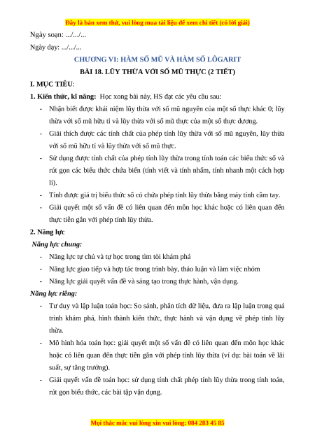 BÀI 18. LŨY THỪA VỚI SỐ MŨ THỰC (2 TIẾT) I. MỤC TIÊU: