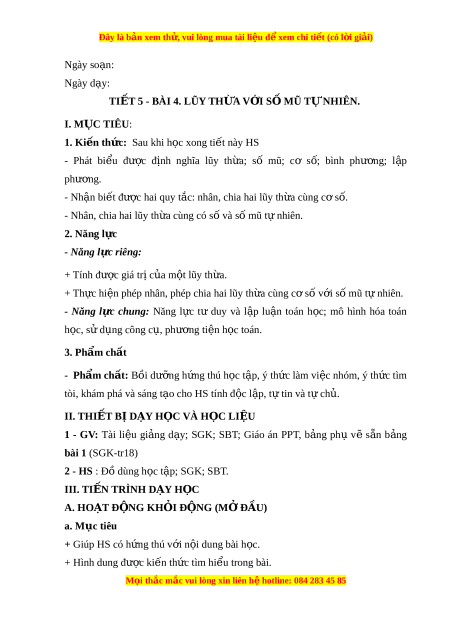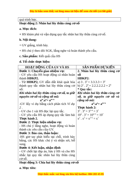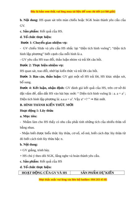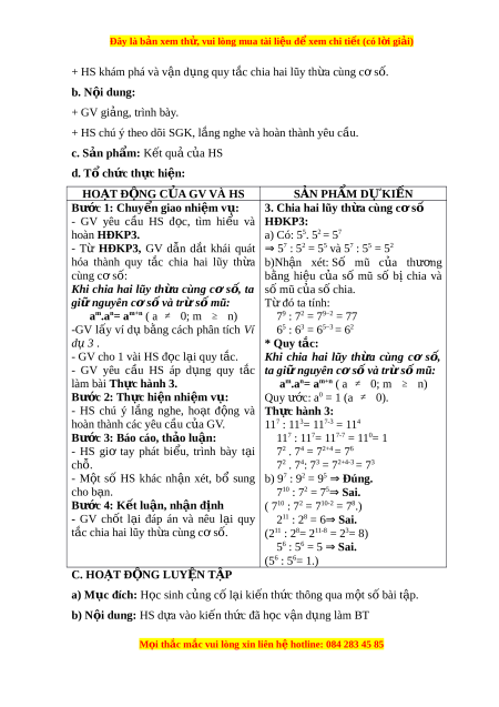 Đây là bản xem th , vu ử i lòng mua tài li u ệ đ xe ể m chi ti t ế (có l i ờ gi i ả ) Bư c ớ 1: Chuy n gi ể ao nhi m ệ v : ụ 1. Lũy th a ừ - GV cho HS đ c ọ hi u ể n i ộ dung đ u ầ Ví d : ụ 10.10.10.10.10.10 = 106 m c. ụ HĐKP1: - GV gi ng, ả phân tích cho HS hi u ể a) 5 . 5 . 5 = 53
