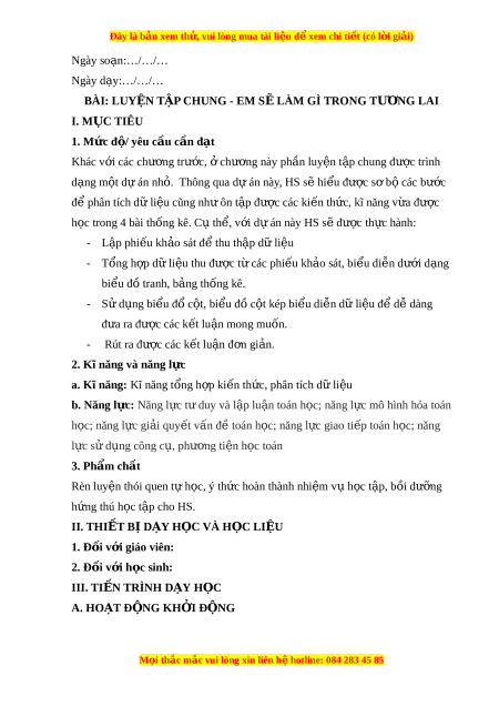 Ệ TẬP CHUNG - EM S L Ẽ ÀM GÌ TRONG TƯ N Ơ G LAI I. M C Ụ TIÊU 1. Mức đ / ộ yêu c u c ầ n đ ầ t ạ Khác v i ớ các chư ng t ơ rư c, ớ ch ở ư ng này ơ ph n l ầ uy n t ệ p chung ậ đư c t ợ rình d ng m ạ t ộ dự án nh . ỏ Thông qua d án này ự , HS sẽ hi u đ ể ư c s ợ b ơ các ộ bư c ớ đ phân t ể ích d l ữ i u cũng nh ệ ôn t ư p ậ đư c các ợ ki n t ế h c, kĩ ứ năng v a ừ đư c ợ h c t ọ rong 4 bài th ng kê. ố C t ụ h , v ể i ớ dự án này HS s đ ẽ ư c ợ th c hành: ự - L p phi ậ u kh ế o s ả át đ t ể hu th p d ậ ữ li u ệ - Tổng h p d ợ l ữ i u t ệ hu đư c ợ t các phi ừ u kh ế o ả sát, bi u di ể n d ễ ư i ớ d ng ạ bi u đ ể ồ tranh, b ng ả thống kê. - S d ử ng bi ụ u đ ể ổ c t ộ , bi u đ ể ồ c t ộ kép bi u di ể n d ễ ữ liệu đ d ể ễ dàng đ a r ư a đư c các ợ k t ế lu n m ậ ong mu n. ố - Rút ra đư c các ợ k t ế lu n đ ậ n ơ gi n. ả