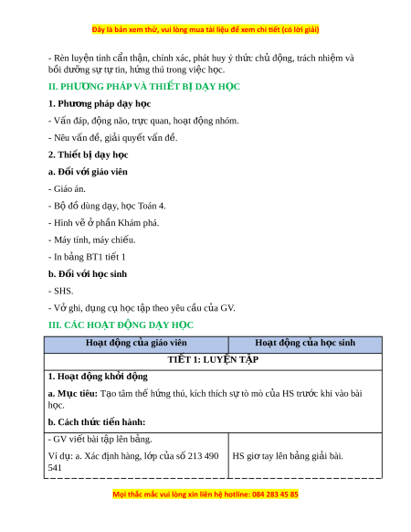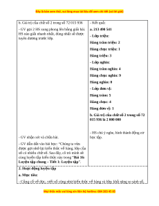 - Rèn luy n t ệ ính c n t ẩ h n, chí ậ nh xác, phát huy ý th c ch ứ đ ủ ng, ộ trách nhi m ệ và bồi dư ng s ỡ ự t t ự in, h ng t ứ hú trong vi c h ệ c. ọ II. PHƯ N Ơ G PHÁP VÀ THI T Ế B D Ị Y Ạ H C Ọ 1. Phư ng ơ pháp d y h ạ c ọ - Vấn đáp, đ ng ộ não, tr c ự quan, ho t ạ đ ng nhóm ộ . - Nêu vấn đ , gi ề i ả quy t ế v n đ ấ . ề 2. Thi t ế b d ị y h ạ c ọ a. Đ i ố v i ớ giáo viên - Giáo án. - Bộ đồ dùng d y ạ , h c ọ Toán 4. - Hình v ẽ ph ở n K ầ hám phá. - Máy tính, máy chi u. ế - In b ng ả BT1 ti t ế 1 b. Đ i ố v i ớ h c s ọ inh - SHS. - Vở ghi, d ng c ụ h ụ c ọ t p t ậ heo yêu c u c ầ a ủ GV. III. CÁC HO T Ạ Đ N Ộ G D Y Ạ H C Ọ Hoạt đ ng c ộ a gi ủ áo viên Hoạt đ ng c ộ a h ủ c s ọ inh TI T Ế 1: LUY N Ệ T P Ậ 1. Hoạt đ ng kh ộ i ở đ ng ộ a. Mục tiêu: T o t ạ âm th h ế ng t ứ