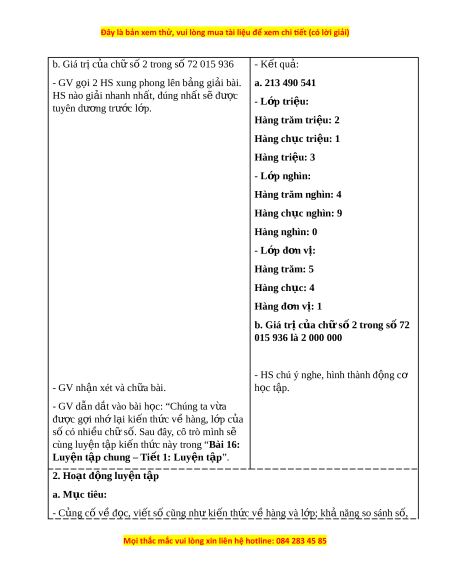 ả bài. a. 213 490 541 HS nào gi i ả nhanh nh t ấ , đúng nh t ấ s đ ẽ ư c ợ - L p ớ tri u: ệ tuyên dư ng t ơ rư c l ớ p. ớ Hàng trăm tri u: ệ 2 Hàng ch c t ụ ri u ệ : 1 Hàng tri u ệ : 3 - L p ớ nghìn: Hàng trăm nghìn: 4 Hàng ch c nghì ụ n: 9 Hàng nghìn: 0 - L p ớ đ n v ơ : ị Hàng trăm: 5 Hàng ch c: ụ 4 Hàng đ n v ơ : ị 1 b. Giá tr c ị a ch ủ s ữ 2 t ố rong s 72 ố 015 936 là 2 000 000
