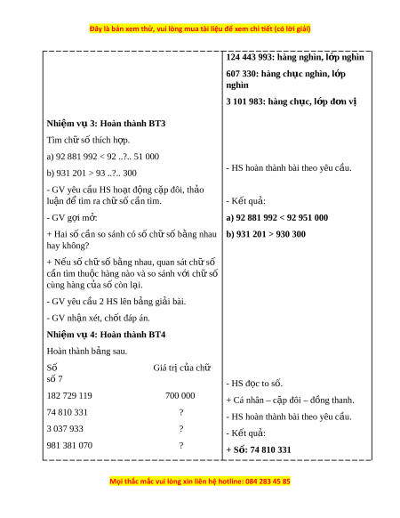 - HS hoàn thành bài theo yêu c u. ầ thành b ng. ả - K t ế quả (b ng ả dư i ớ ) - GV g i ọ 3 HS lên b ng ả làm t ng hàng, c ừ ả l p s ớ o sánh và nh n ậ xét bài trên b ng. ả - GV ch a ữ bài, chốt đáp án. Nhi m ệ v 2: ụ Hoàn thành BT2 Mỗi ch s ữ ố đư c ợ g ch ạ chân dư i ớ đây thu c ộ hàng nào, l p nào? ớ 6 800 287 124 443 993 607 330 3 101 983 - GV cho HS t t ự rình bày bài vào v ghi ở .