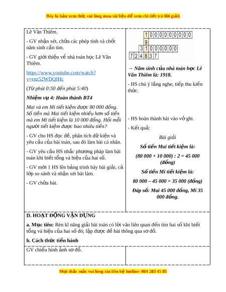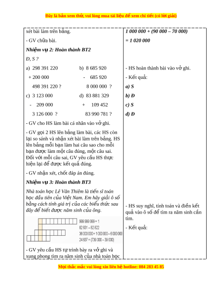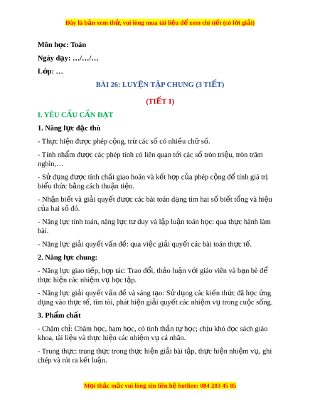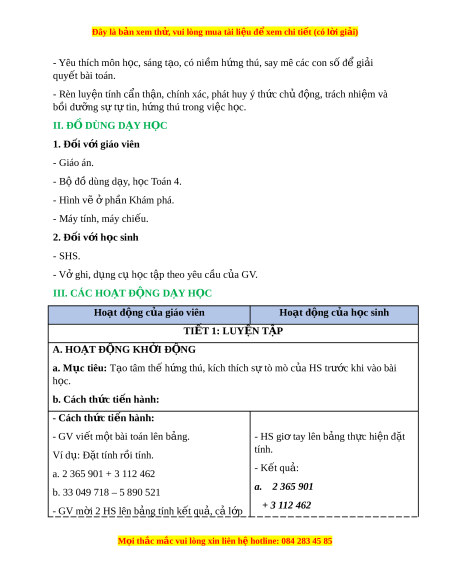 Đây là bản xem th , vu ử i lòng mua tài li u ệ đ xe ể m chi ti t (c ế ó l i ờ gi i ả ) - Yêu thích môn h c, s ọ áng t o, có ạ ni m ề h ng t ứ hú, say mê các con s đ ố gi ể i ả quy t ế bài toán. - Rèn luy n t ệ ính c n t ẩ h n, chí ậ nh xác, phát huy ý th c ch ứ đ ủ ng, ộ trách nhi m ệ và bồi dư ng s ỡ ự t t ự in, h ng t ứ hú trong vi c h ệ c. ọ II. Đ D Ồ ÙNG D Y Ạ H C Ọ 1. Đ i ố v i ớ giáo viên - Giáo án. - Bộ đồ dùng d y ạ , h c ọ Toán 4. - Hình v ẽ ph ở n K ầ hám phá. - Máy tính, máy chi u. ế 2. Đ i ố v i ớ h c s ọ inh - SHS. - Vở ghi, d ng c ụ h ụ c ọ t p t ậ heo yêu c u c ầ a ủ GV. III. CÁC HO T Ạ Đ N Ộ G D Y Ạ H C Ọ Hoạt đ ng c ộ a gi ủ áo viên Hoạt đ ng c ộ a h ủ c s ọ inh TI T Ế 1: LUY N Ệ T P Ậ A. HOẠT Đ N Ộ G KH I Ở Đ N Ộ G a. Mục tiêu: T o t ạ âm th h ế ng t ứ
