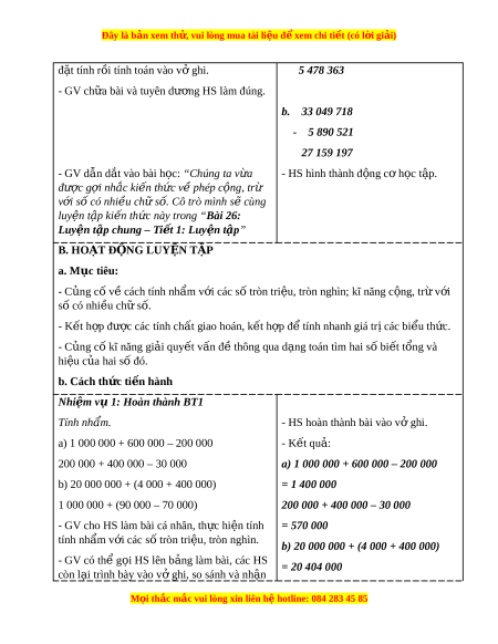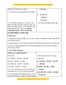ệ ập chung – Ti t ế 1: Luy n t ệ p ậ ” B. HO T Ạ Đ N Ộ G LUY N Ệ T P Ậ a. Mục tiêu: - C ng ủ cố v cách t ề ính nh m ẩ v i ớ các s t ố ròn tri u, t ệ ròn nghìn; kĩ năng c ng, t ộ r v ừ i ớ số có nhi u ch ề ữ số. - K t ế h p đ ợ ư c các ợ tính ch t ấ giao hoán, k t ế h p đ ợ t ể ính nhanh giá tr các bi ị u t ể h c. ứ - C ng ủ cố kĩ năng gi i ả quy t ế v n đ ấ t ề hông qua d ng ạ toán tìm hai s bi ố t ế t ng và ổ hiệu c a hai ủ số đó. b. Cách th c t ứ i n hành ế Nhi m ệ v 1