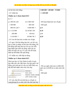 hú, kích thích sự tò mò c a H ủ S trư c khi ớ vào bài h c. ọ b. Cách th c t ứ i n hành: ế - Cách th c t ứ i n hành ế : - GV vi t ế m t ộ bài toán lên b ng. ả - HS gi t ơ ay lên b ng ả th c hi ự n đ ệ t ặ tính. Ví d : ụ Đ t ặ tính r i ồ tính. - K t ế qu : ả a. 2 365 901 + 3 112 462 a. 2 365 901 b. 33 049 718 – 5 890 521 + 3 112 462 - GV m i ờ 2 HS lên b ng ả tính k t ế qu , c ả l ả p ớ M i