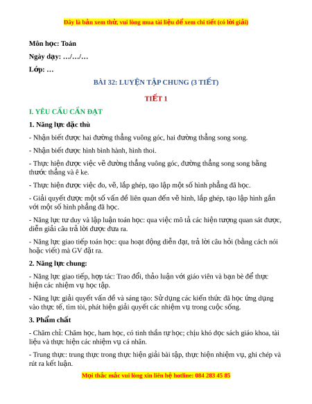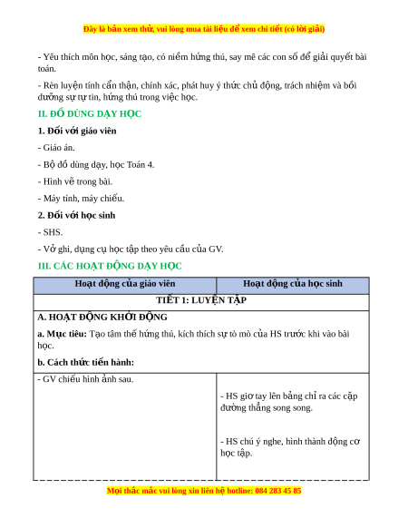 Đây là bản xem th , vu ử i lòng mua tài li u ệ đ xe ể m chi ti t (c ế ó l i ờ gi i ả ) - Yêu thích môn h c, s ọ áng t o, có ạ ni m ề h ng t ứ hú, say mê các con s đ ố gi ể i ả quy t ế bài toán. - Rèn luy n t ệ ính c n t ẩ h n, chí ậ nh xác, phát huy ý th c ch ứ đ ủ ng, ộ trách nhi m ệ và b i ồ dư ng ỡ s t ự t ự in, h ng t ứ hú trong vi c h ệ c. ọ II. Đ D Ồ ÙNG D Y Ạ H C Ọ 1. Đ i ố v i ớ giáo viên - Giáo án. - Bộ đồ dùng d y ạ , h c ọ Toán 4. - Hình v t ẽ rong bài. - Máy tính, máy chi u. ế 2. Đ i ố v i ớ h c s ọ inh - SHS. - Vở ghi, d ng c ụ h ụ c ọ t p t ậ heo yêu c u c ầ a ủ GV. III. CÁC HO T Ạ Đ N Ộ G D Y Ạ H C Ọ Hoạt đ ng c ộ a gi ủ áo viên Hoạt đ ng c ộ a h ủ c s ọ inh TI T Ế 1: LUY N Ệ T P Ậ A. HOẠT Đ N Ộ G KH I Ở Đ N Ộ G a. Mục tiêu: T o t ạ âm th h ế ng t ứ