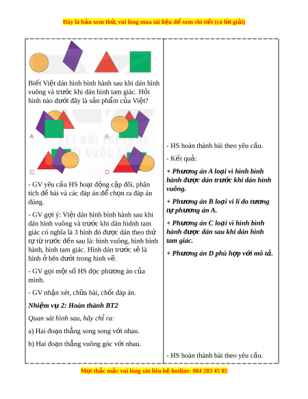 hành, hình tam giác. Hình dán trư c s ớ ẽ là + Phư ng án D ơ phù h p v ợ i ớ mô t . ả hình bên d ở ư i ớ trong hình v . ẽ - GV g i ọ m t ộ số HS đ c ọ phư ng án c ơ a ủ mình. - GV nh n ậ xét, ch a bài ữ , chốt đáp án. Nhi m ệ v 2