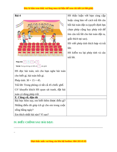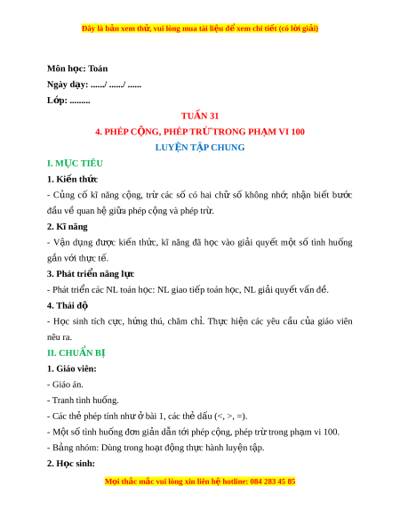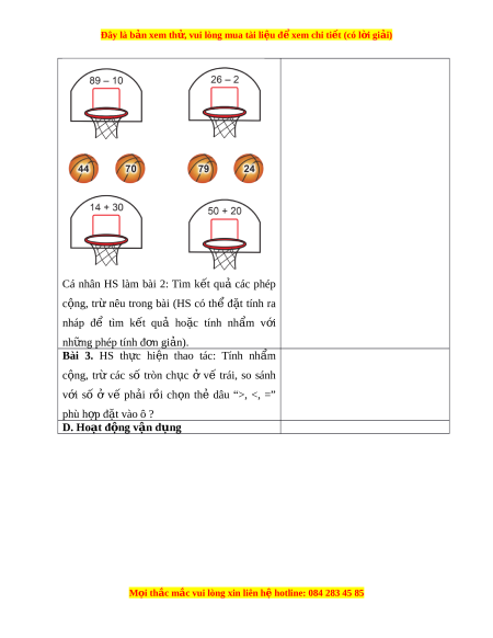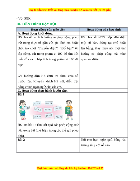 Đây là bản xem th , vu ử i lòng mua tài li u ệ đ xe ể m chi ti t (c ế ó l i ờ gi i ả ) - V , ở SGK III. TI N Ế TRÌNH D Y Ạ H C Ọ Hoạt đ ng c ộ a gi ủ áo viên Hoạt đ ng c ộ a h ủ c s ọ inh A. Hoạt đ ng k ộ h i ở đ ng. ộ HS chia sẻ các tình hu ng ố có phép c ng, ộ phép HS chia sẻ trư c ớ l p: ớ đ i ạ di n ệ trừ trong th c ự tế gắn v i ớ gia đình em ho c ặ m t ộ số bàn, đ ng ứ t i ạ chỗ ho c ặ ch i ơ trò ch i ơ “Truy n ề đi n”, ệ “Đố b n” ạ ôn lên b ng, ả thay nhau nói m t ộ tình t p ậ c ng, ộ trừ trong ph m ạ vi 100 để tìm k t ế huống có phép c ng ộ mà mình quả c a