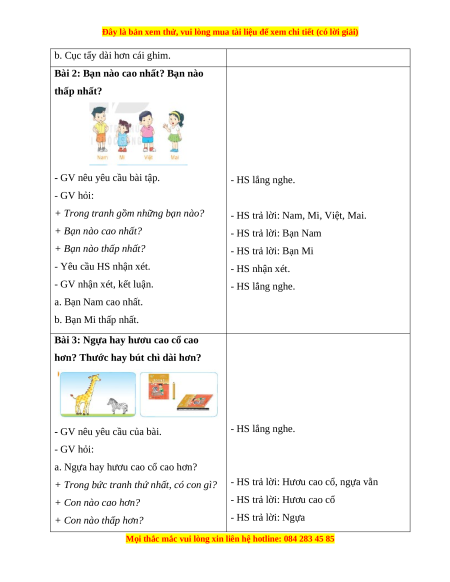 - GV nhận xét, kết luận. - HS lắng nghe. a. Bạn Nam cao nhất. b. Bạn Mi thấp nhất.