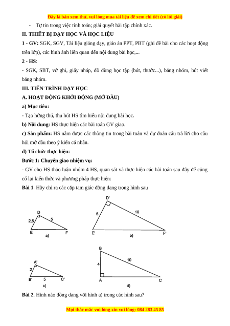 + Các trường hợp đồng dạng của tam giác vuông; + Hình đồng dạng. b) Nội dung: