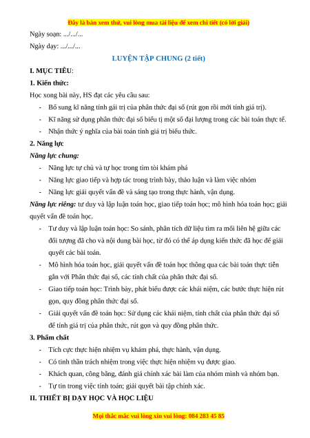 LUYỆN TẬP CHUNG (2 tiết) I. MỤC TIÊU: