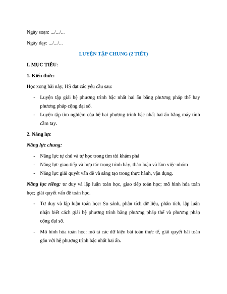 LUYỆN TẬP CHUNG (2 TIẾT) I. MỤC TIÊU: