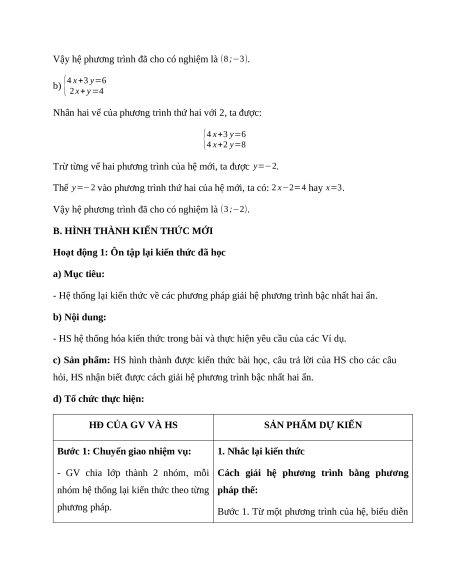 - Hệ thống lại kiến thức về các phương pháp giải hệ phương trình bậc nhất hai ẩn. b) Nội dung: