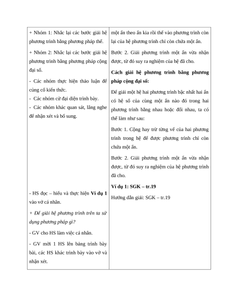 - GV chia lớp thành 2 nhóm, mỗi Cách giải hệ phương trình bằng phương