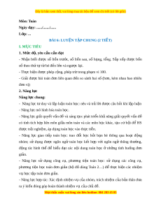 Ngày dạy: ....../......./...... L p: ớ ... BÀI 6: LUY N Ệ TẬP CHUNG (2 TI T Ế ) I. M C Ụ TIÊU 1. Mức đ , ộ yêu c u c ầ n đ ầ t ạ - Nh n ậ bi t ế đư c ợ số li n ề trư c, ớ số li n ề sau, số h ng, ạ t ng. ổ S p ắ x p ế đư c ợ b n ố số theo thứ t t ự bé đ ừ n l ế n và ng ớ ược l i ạ . - Th c hi ự n đ ệ ư c ợ phép c ng, phép t ộ r t ừ rong ph m ạ vi 100. - Gi i ả đư c ợ bài toán đ n ơ liên quan đ n ế so sánh hai s ố (h n, ơ kém nhau bao nhiêu đ n ơ v ) ị 2. Năng l c ự Năng l c chung ự : - Năng l c t ự duy và ư l p l ậ u n t ậ oán h c: ọ nêu và tr l ả i ờ đư c ợ câu h i ỏ khi l p ậ lu n ậ - Năng l c m ự ô hình hóa toán h c. ọ - Năng l c ự gi i ả quy t ế v n ấ đ và ề sáng t o: ạ phát tri n ể kh ả năng gi i ả quy t ế v n ấ đề có tính tích h p ợ liên môn gi a