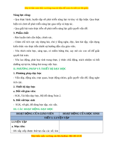 ọ thắc mắc vui lòng xin liên hotline: 084 283 45 85 Đây là bản xem th , vui ử lòng mua tài li u ệ đ xe ể m chi ti t ế (có l i ờ gi i ả ) Năng l c ri ự êng: - Qua th c ự hành, luy n ệ t p ậ sẽ phát tri n ể năng l c ự tư duy và l p ậ lu n. ậ Qua th c ự hiện trò ch i ơ s phát ẽ tri n năng l ể c gi ự ao ti p và ế h p t ợ ác. - Qua gi i ả bài toán th c t ự i n s ễ phát ẽ tri n năng l ể c gi ự i ả quy t ế v n đ ấ . ề 3. Phẩm ch t ấ - Rèn luy n t ệ ính c n t ầ h n, chí ậ nh xác. - Chăm chỉ tích c c ự xây d ng ự bài, chú ý l ng ắ nghe, đ c, ọ làm bài t p, ậ v n ậ d ng ụ ki n t ế h c ứ vào th c t ự i n d ễ ư i ớ s h ự ư ng d ớ n c ẫ a ủ giáo viên. - Yêu thích môn h c, ọ sáng t o, ạ có ni m ề h ng
