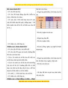 ứ thú, say mê các con số để gi i ả quy t ế bài toán. - Yêu lao đ ng, ộ phát huy tính trung th c, ự ý th c ứ chủ đ ng, ộ trách nhi m ệ và b i ồ dư ng ỡ s t ự t ự in, h ng t ứ hú trong vi c h ệ c. ọ II. PHƯ N Ơ G PHÁP VÀ THI T Ế B D Ị Y Ạ H C Ọ 1. Phư ng ơ pháp d y h ạ c ọ - Vấn đáp, đ ng ộ não, tr c ự quan, ho t ạ đ ng ộ nhóm, gi i ả quy t ế v n ấ đ , ề l ng ắ nghe tích c c. ự 2. Thi t ế b d ị y h ạ c ọ a. Đ i ố v i ớ giáo viên: - SGK, Tài li u d ệ y h ạ c, ọ B đ ộ dùng ồ Toán 2. b. Đ i ố v i ớ h c s ọ inh - SGK, v ghi ở , đ dùng h ồ c t ọ p, ậ xúc x c. ắ III. CÁC HO T Ạ Đ N Ộ G D Y Ạ H C Ọ HOẠT Đ N Ộ G C A Ủ GIÁO VIÊN HOẠT Đ N Ộ G C A Ủ H C Ọ SINH TI T Ế 1: LUY N Ệ T P Ậ LUYỆN T P Ậ a. Mục tiêu: - HS s p ắ x p ế đư c ợ thứ tự c a ủ các s ; ố tìm M i