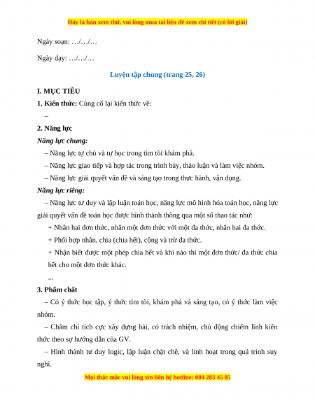 – HS rèn luyện được kĩ năng nhân hai đa thức, chia đa thức cho đơn thức và khi