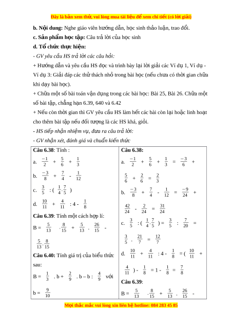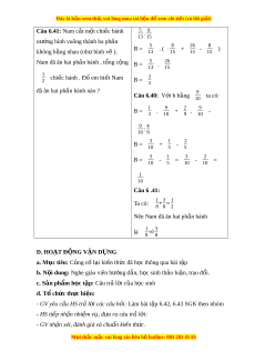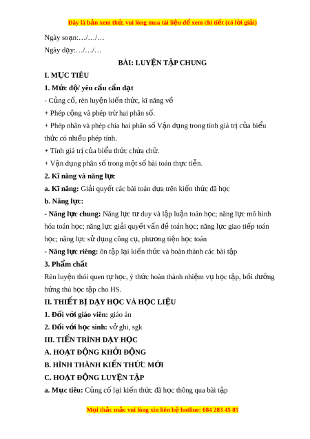 Đây là bản xem th , vu ử i lòng mua tài li u ệ đ xe ể m chi ti t ế (có l i ờ gi i ả ) Ngày so n: ạ …/…/… Ngày d y: ạ …/…/… BÀI: LUY N Ệ TẬP CHUNG I. M C Ụ TIÊU 1. Mức đ / ộ yêu c u c ầ n đ ầ t ạ - C ng ủ cố, rèn luy n ki ệ n t ế h c, ứ kĩ năng về + Phép c ng và phép t ộ r hai ừ phân s . ố