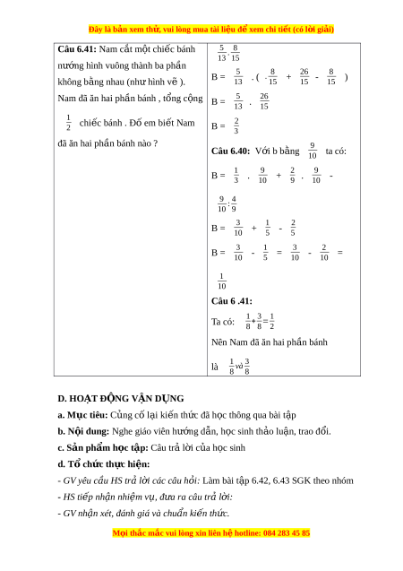Đây là bản xem th , vu ử i lòng mua tài li u ệ đ xe ể m chi ti t ế (có l i ờ gi i ả ) Câu 6.41: Nam c t ắ m t ộ chi c ế bánh 5 8 . 13 15 nư ng hì ớ nh vuông thành ba ph n ầ 5 8 26 8 không b ng nhau ( ằ nh hì ư nh vẽ ). B = . ( . + - ) 13 15 15 15