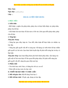 Ngày dạy: ....../......./...... L p: ớ ... BÀI 45: LUY N Ệ TẬP CHUNG I. M C Ụ TIÊU 1. Ki n t ế h c ứ - Bi t ế đư c ợ y nghĩa c a phép ủ nhân, phép chia và th c ự hi n đ ệ ư c ợ các phép nhân, phép chia đã h c ọ - Gi i ả đư c ợ bài toán th c t ự ( ế bài toán có l i