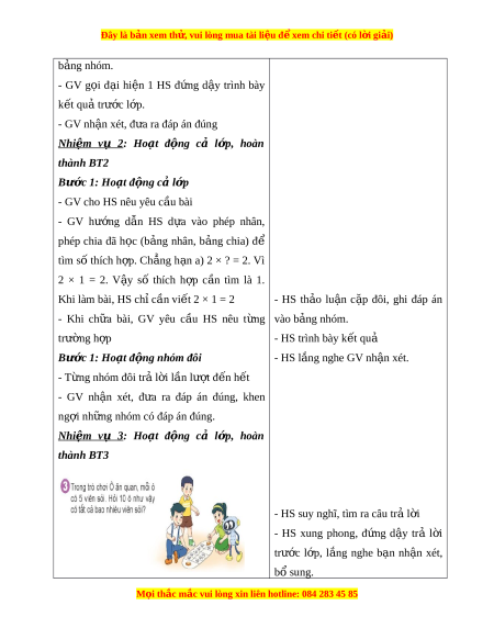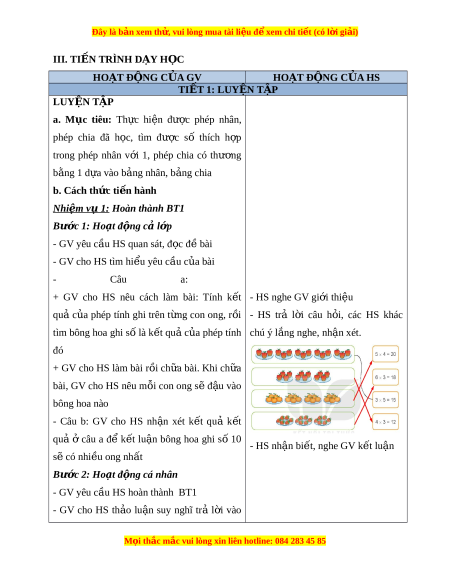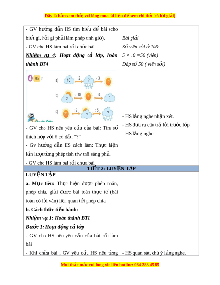 Đây là bản xem th , vu ử i lòng mua tài li u ệ đ xe ể m chi ti t (c ế ó l i ờ gi i ả ) III. TI N Ế TRÌNH D Y Ạ H C Ọ HOẠT Đ N Ộ G C A Ủ GV HOẠT Đ N Ộ G C A Ủ HS TI T Ế 1: LUY N Ệ T P Ậ LUYỆN TẬP a. M c ụ tiêu: Th c ự hi n ệ đư c ợ phép nhân, phép chia đã h c, ọ tìm đư c ợ số thích h p ợ trong phép nhân v i ớ 1, phép chia có thư ng ơ b ng ằ 1 d a vào b ự ng ả nhân, b ng chi ả a b. Cách th c ứ ti n hàn ế h Nhi m ệ v 1: