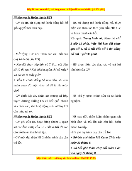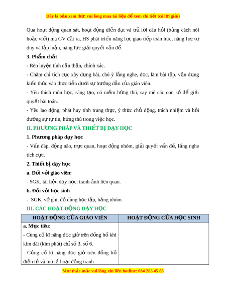 ứ thú, say mê các con số để gi i ả quy t ế bài toán. - Yêu lao đ ng, ộ phát huy tính trung th c, ự ý th c ứ chủ đ ng, ộ trách nhi m ệ và b i ồ dư ng ỡ s t ự t ự in, h ng t ứ hú trong vi c h ệ c. ọ II. PHƯ N Ơ G PHÁP VÀ THI T Ế B D Ị Y Ạ H C Ọ 1. Phư ng ơ pháp d y h ạ c ọ - Vấn đáp, đ ng ộ não, tr c ự quan, ho t ạ đ ng ộ nhóm, gi i ả quy t ế v n ấ đ , ề l ng ắ nghe tích c c. ự 2. Thi t ế b d ị y h ạ c ọ a. Đ i ố v i ớ giáo viên: - SGK, tài li u d ệ y h ạ c, t ọ ranh nh ả liên quan. b. Đ i ố v i ớ h c s ọ inh - SGK, v ghi ở , đ dùng h ồ c t ọ p, ậ b ng nhóm ả . III. CÁC HO T Ạ Đ N Ộ G D Y Ạ H C Ọ HOẠT Đ N Ộ G C A Ủ GIÁO VIÊN HOẠT Đ N Ộ G C A Ủ H C Ọ SINH a. Mục tiêu: - Cùng cố kĩ năng đ c ọ gi ờ trên đ ng ồ h ồ khi kim dài (kim phút) ch s ỉ 3, s ố 6. ố - C ng ủ cố kĩ năng đ c ọ giờ trên đ ng ồ hồ điện t và m ử ô t ho ả t ạ đ ng t ộ ranh M i