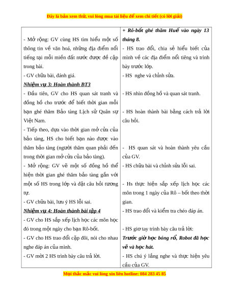 - HS quan sát và hoàn thành yêu c u ầ trong th i ờ gian mở c a c ử a ủ b o t ả àng). c a G ủ V. - Mở r ng: ộ GV vẽ m t ộ số đ ng ồ hồ thể - HS ch a ữ bài và ch nh s ỉ a ử l i ỗ sai. hiện th i ờ gian ghé thăm b o ả tàng g n ắ v i ớ m t ộ số HS trong l p ớ và đ t ặ câu h i ỏ tư ng ơ - Hs th c ự hi n ệ s p ắ x p ế l ch ị h c ọ các t . ự môn trong 1 ngày c a ủ Rô – b t ố theo th i ờ - GV ch a ữ bài, l u ý H ư S l i ỗ sai. gian. Nhi m ệ v 4