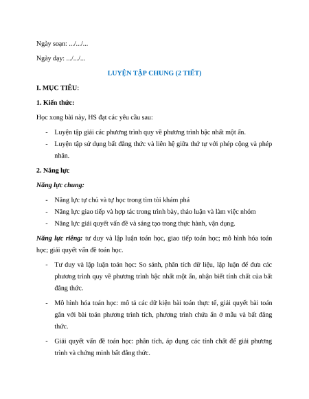 LUYỆN TẬP CHUNG (2 TIẾT) I. MỤC TIÊU: